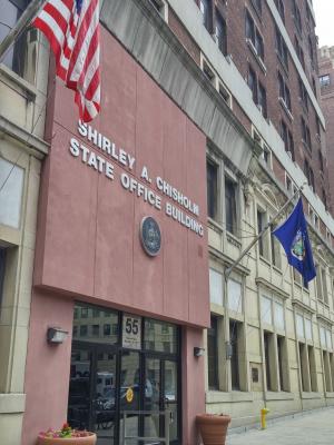 The New York State Office Building is at 55 Hanson Place, a brick building right across the street from the Atlantic Center and down the street from the Williamsburgh Bank Building, with the landmark clock tower.